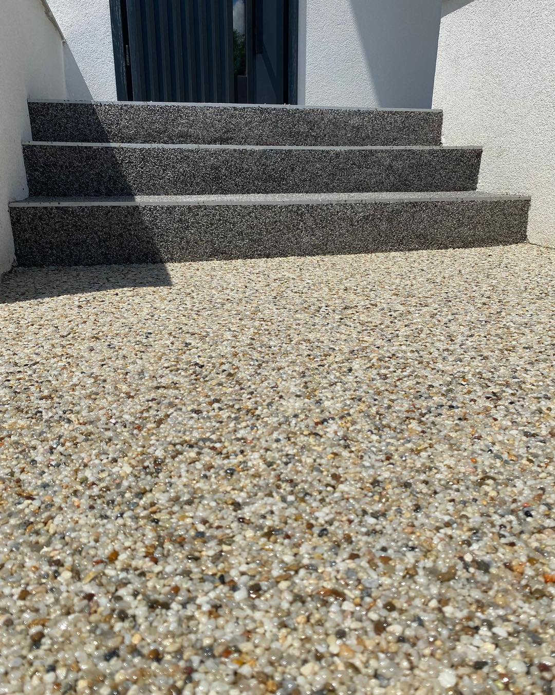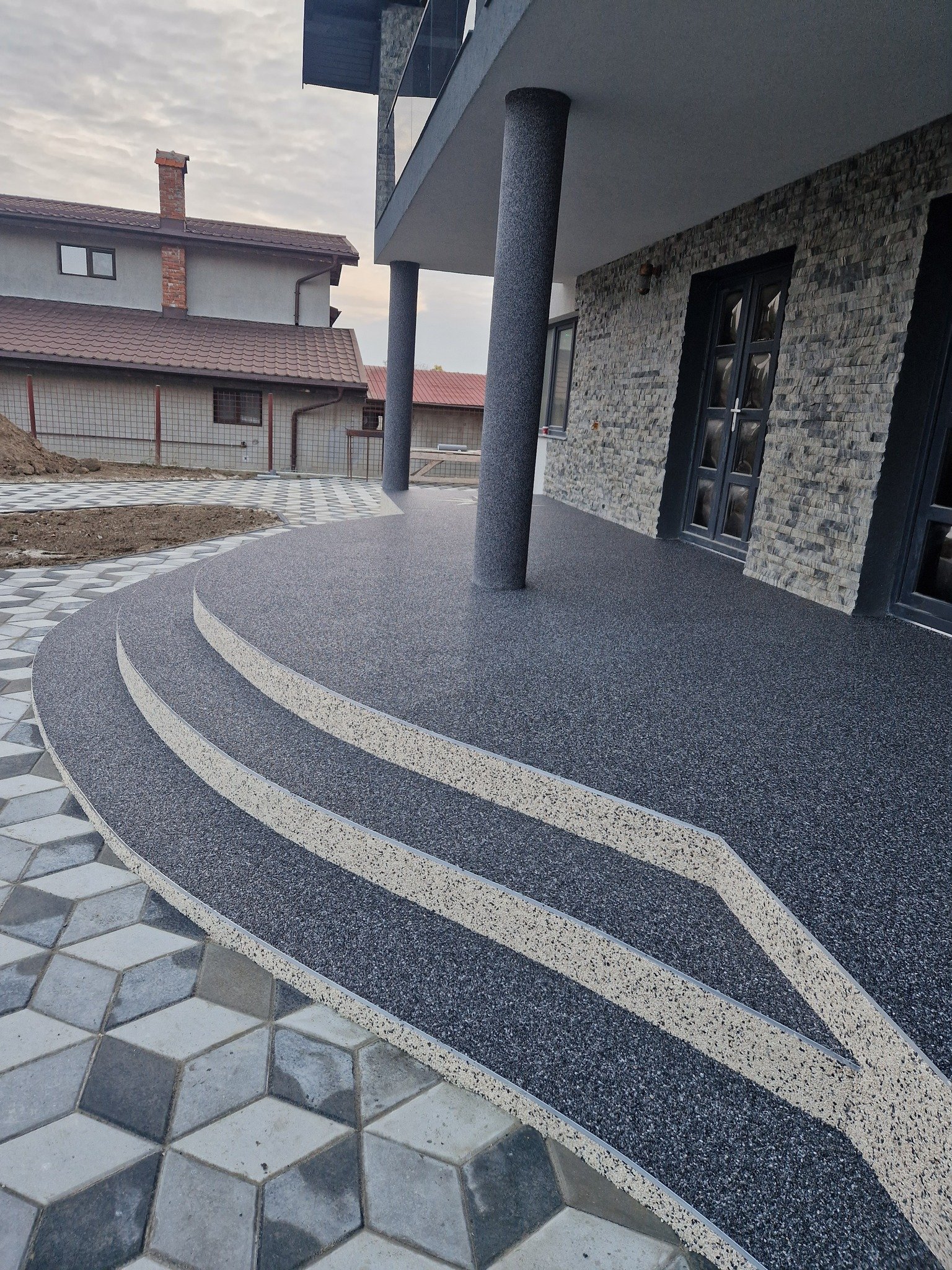 Covorul de piatră este un sistem decorativ drenat realizat din piatră naturală (quartz sau marmură) stabilizată cu rășină poliuretanică profesională, aplicat manual într-un strat de aproximativ 1–1,5 cm.