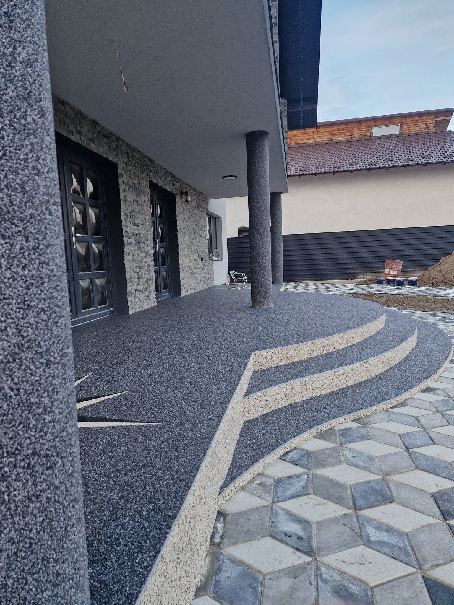 Aceste combinații permit obținerea unei suprafețe continue, estetice și rezistente. Pentru zonele expuse la soare, alegerea rășinii potrivite (de exemplu, cu stabilitate bună la UV) este importantă pentru menținerea aspectului în timp.